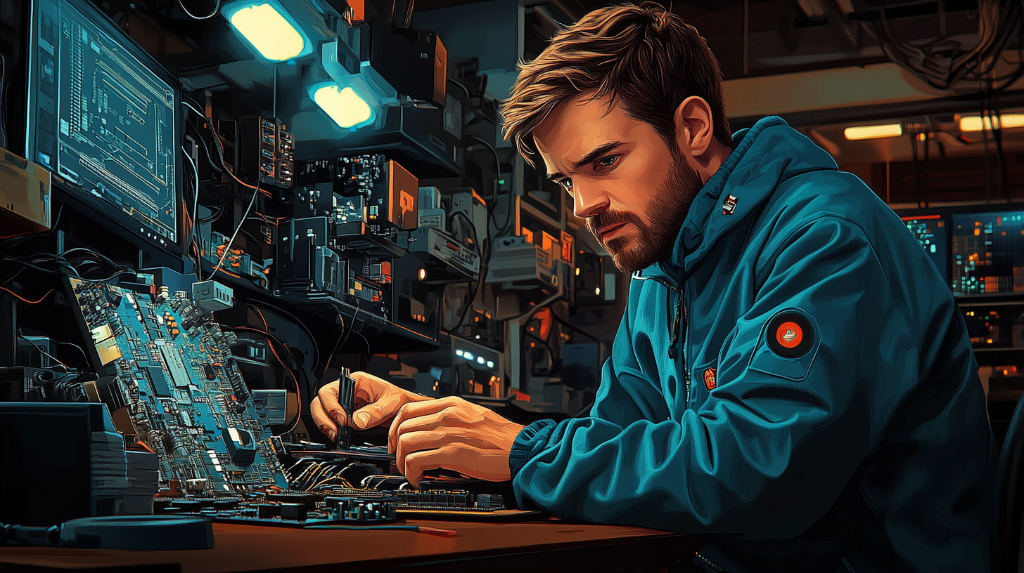 Серверные стойки — 19" рамы с серверами, PDU, кабелями; сетевое — свитчи, роутеры, АТС, оптика, модемы. Компоненты: платы, HDD/SSD, RAM, корпуса, аккумуляторы ИБП.